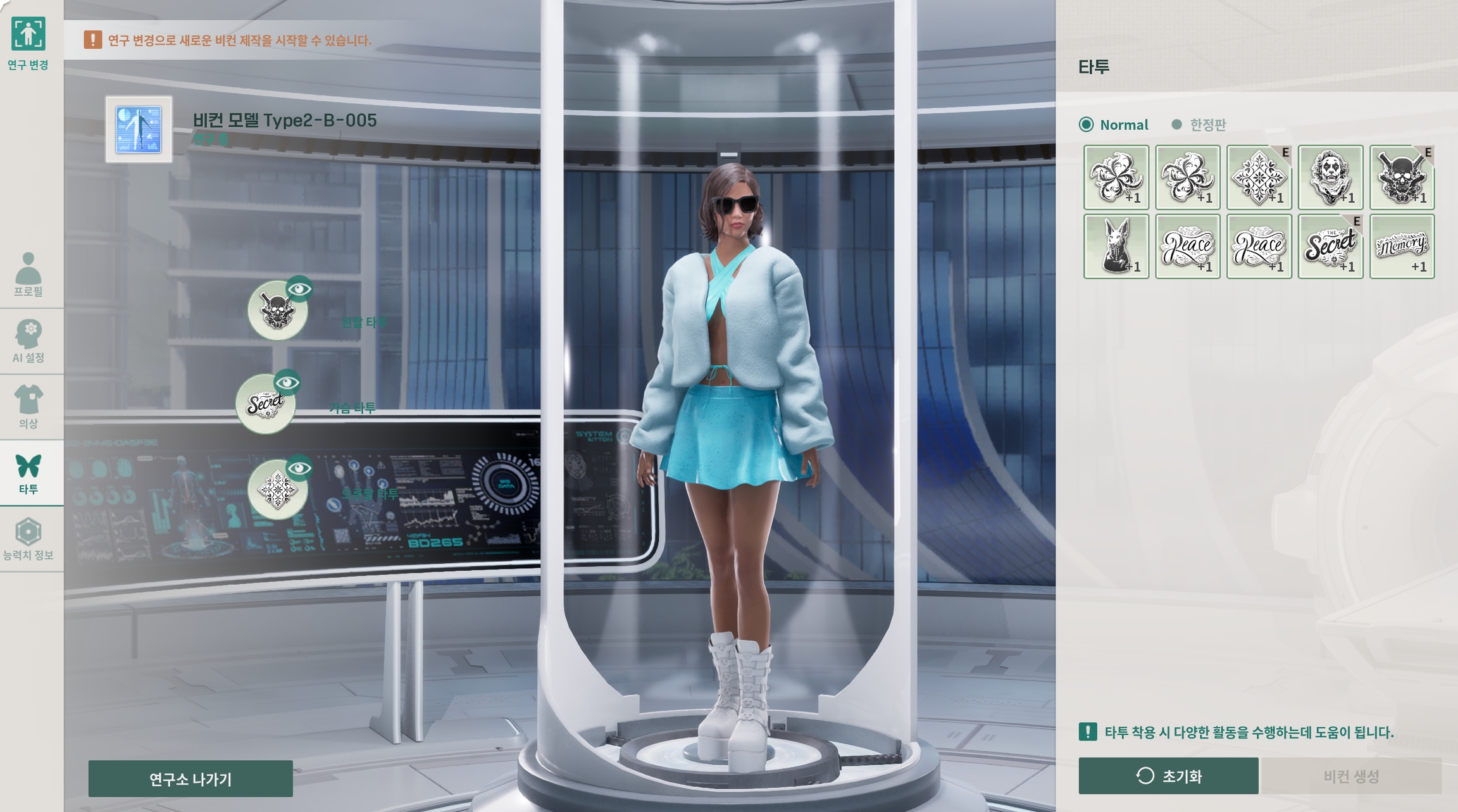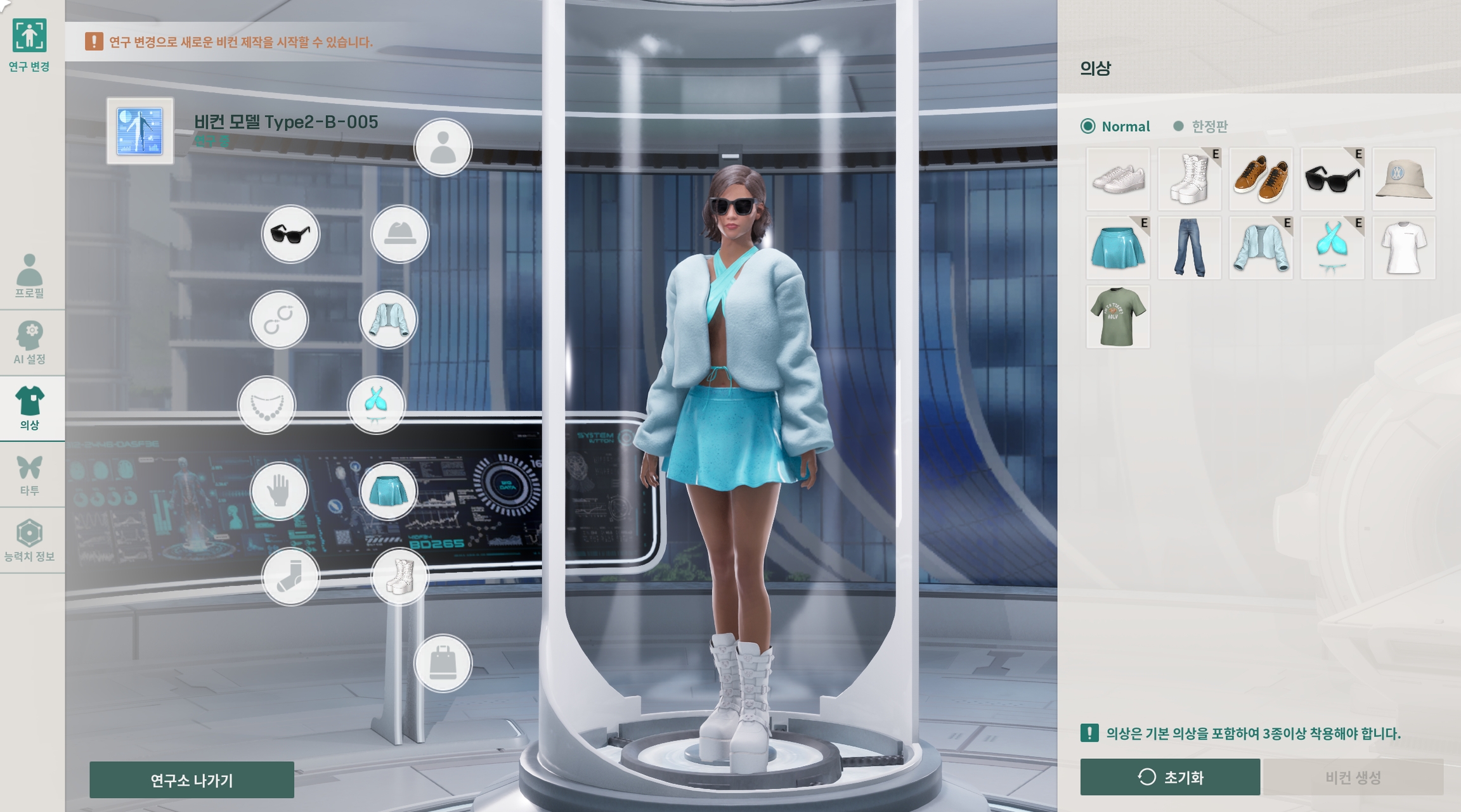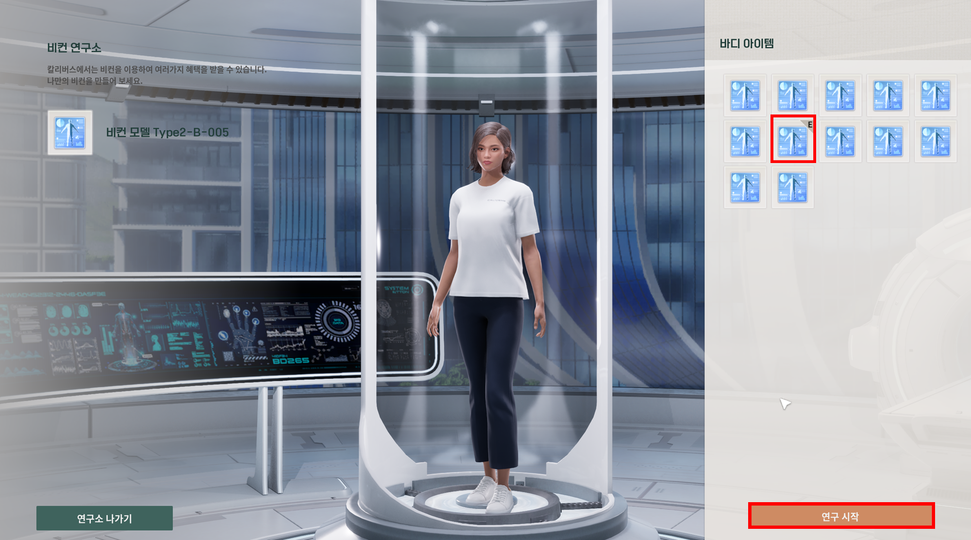 바디 아이템을 선택 후, [연구 시작]버튼을 클릭해 주세요.