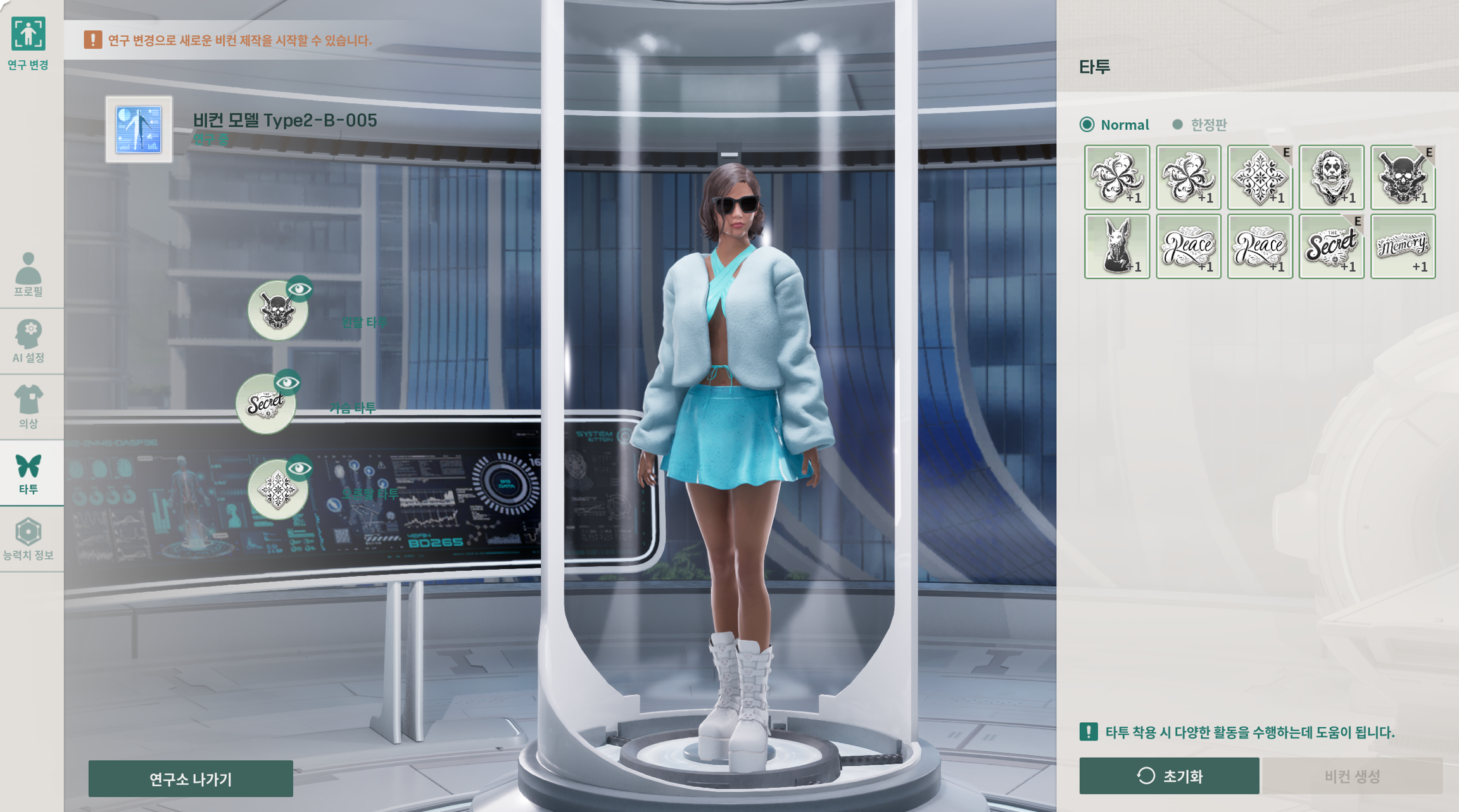 한 번 장착된 타투는 다른 타투로 교체 시 사라지니 신중하게 선택해 주세요.