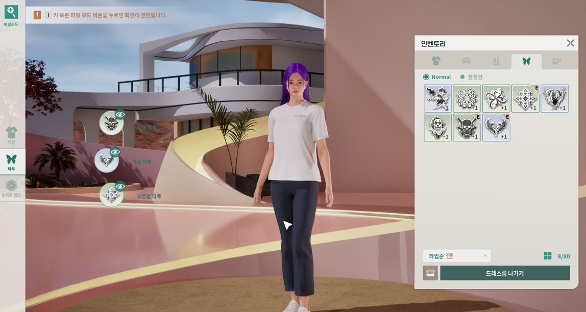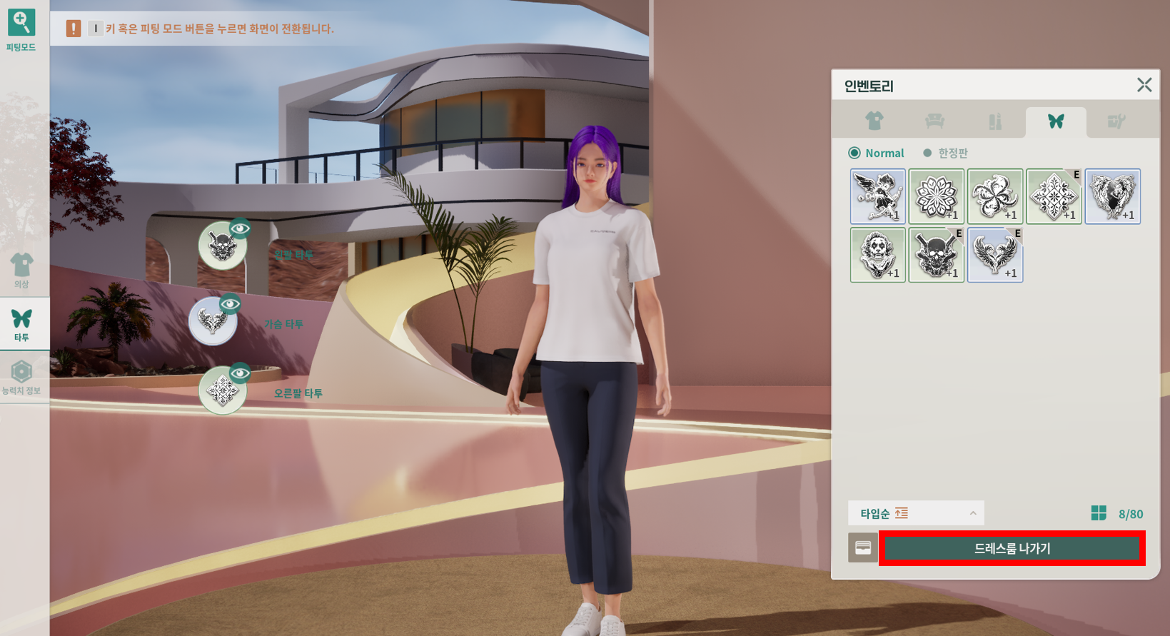 타투 장착을 완료한 후 [드레스룸 나가기] 버튼을 클릭합니다.