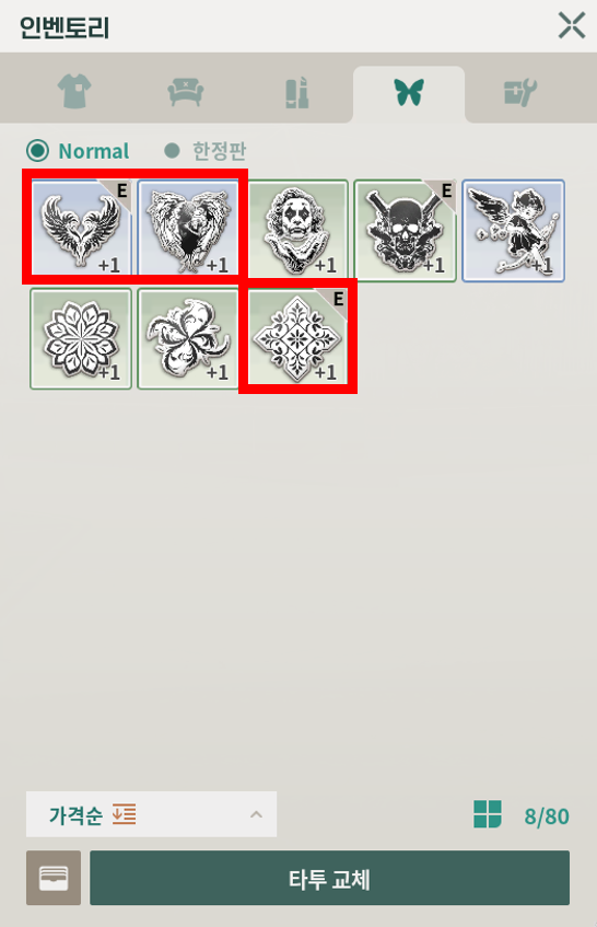 장착이 완료된 타투는 [E]표시가 됩니다.