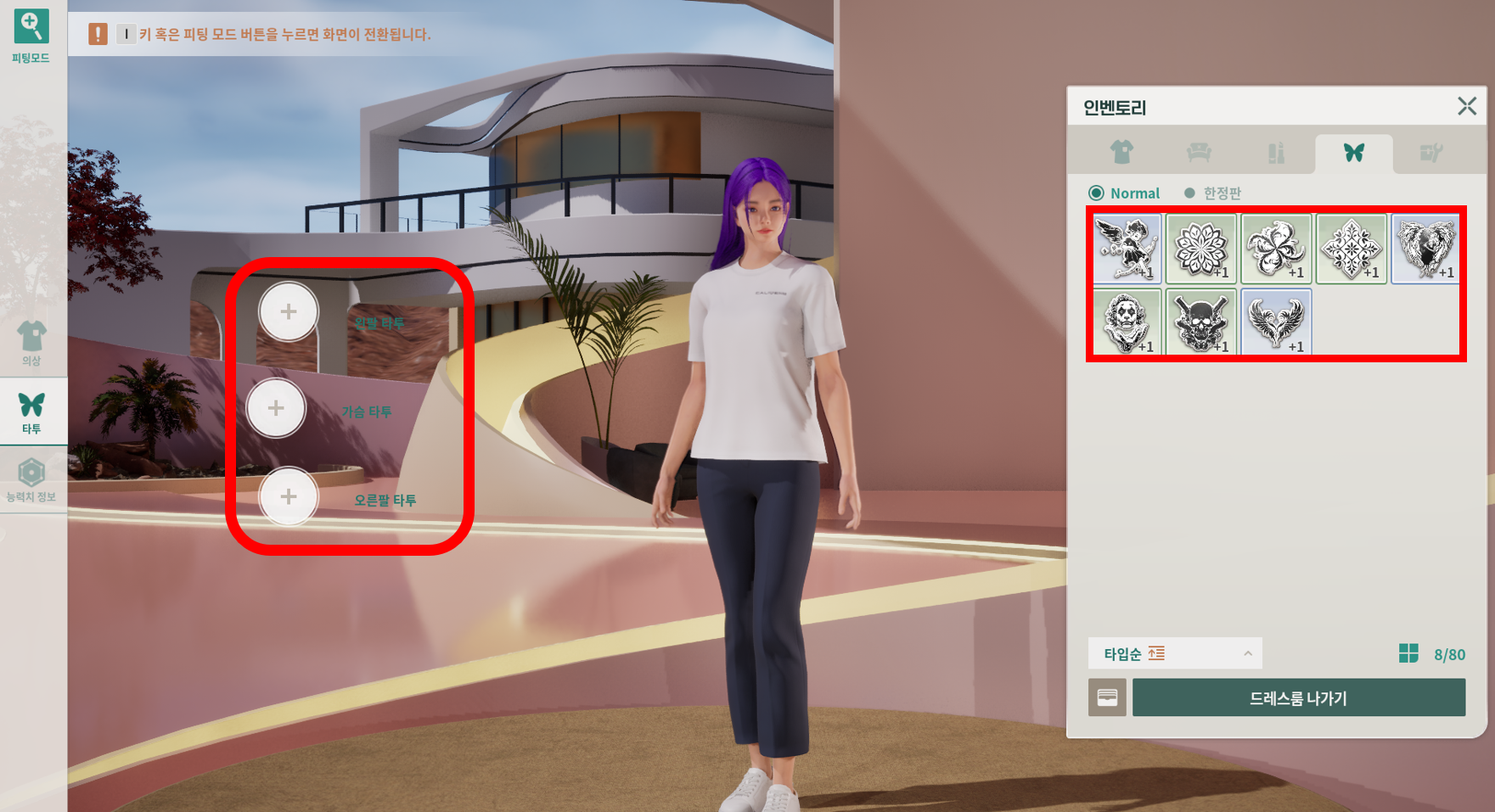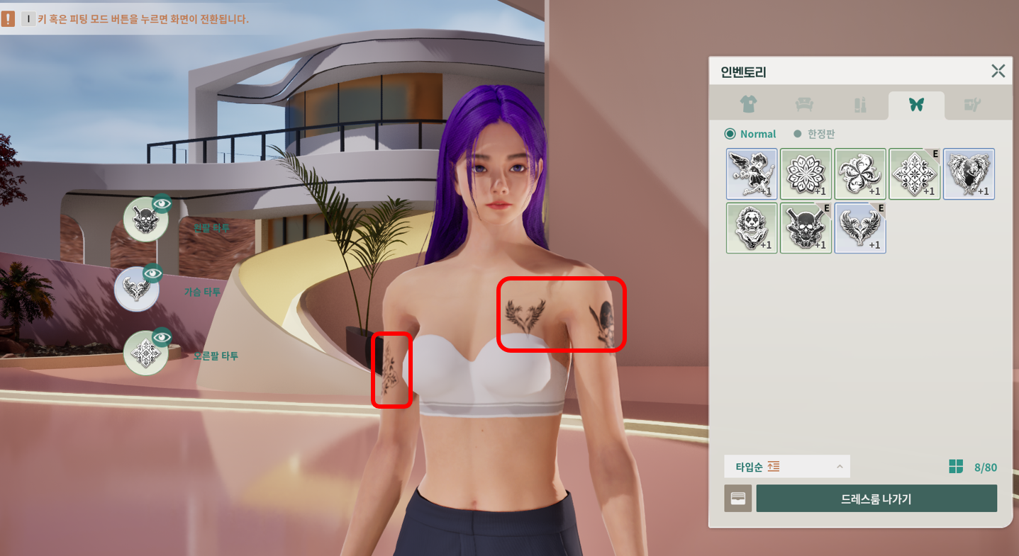나비 모양 아이콘을 클릭하면 타투 장착이 가능한 신체 부위와 현재 장착 가능한 타투들이 나타납니다.