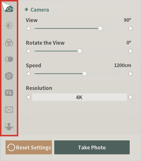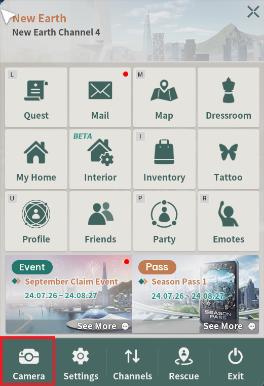 [ESC] 키를 눌러 메뉴 호출 후 [Camera] 버튼을 클릭합니다.