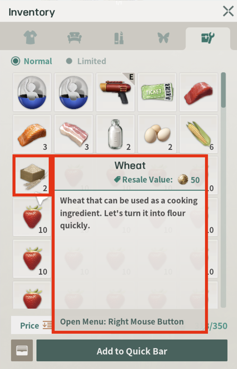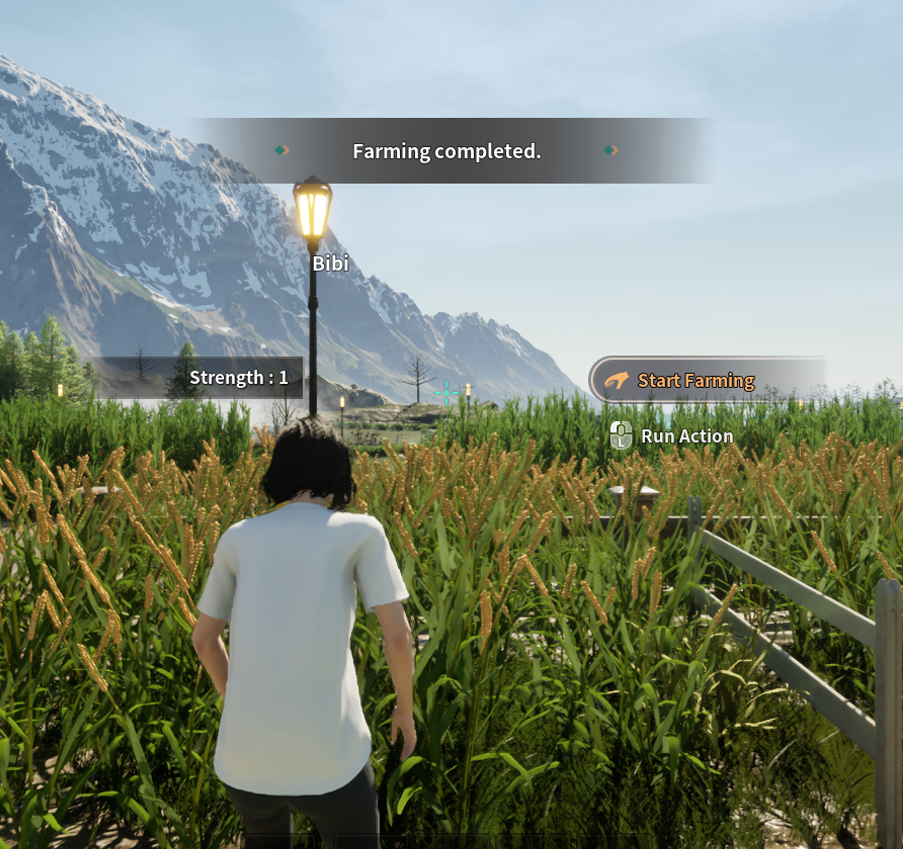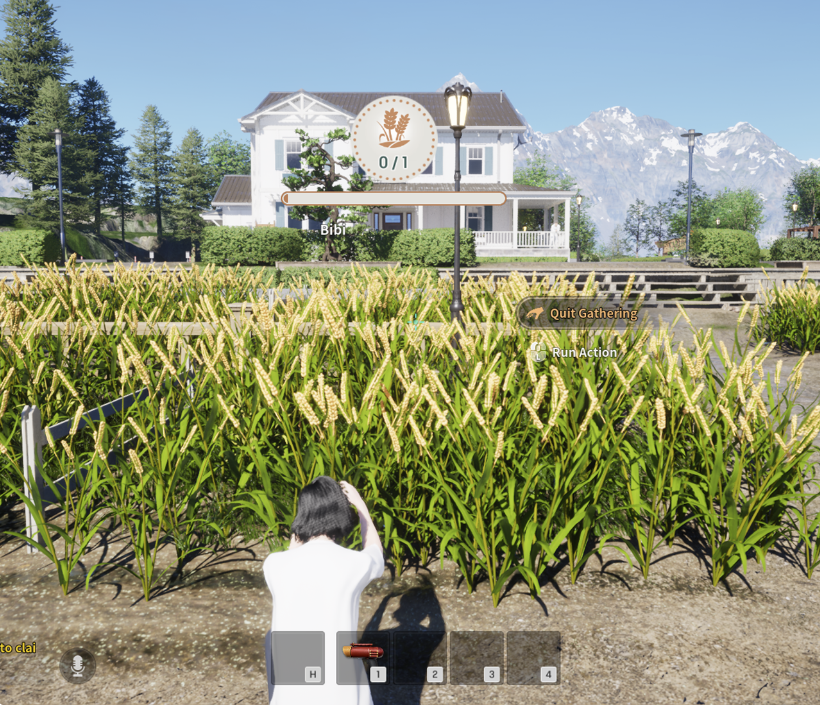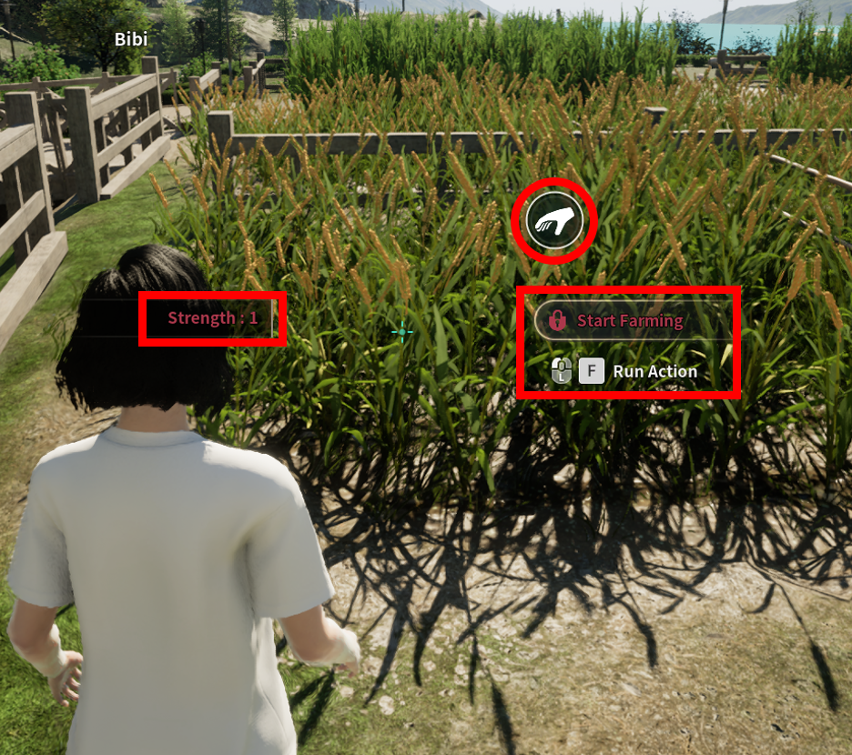 파밍을 희망하는 농작물과 가축의 여물통에 가까이 가면 파밍 아이콘이 나타납니다. 왼쪽 마우스 버튼을 길게 누른 후 [Start Gathering] 버튼을 눌러 파밍을 진행합니다.