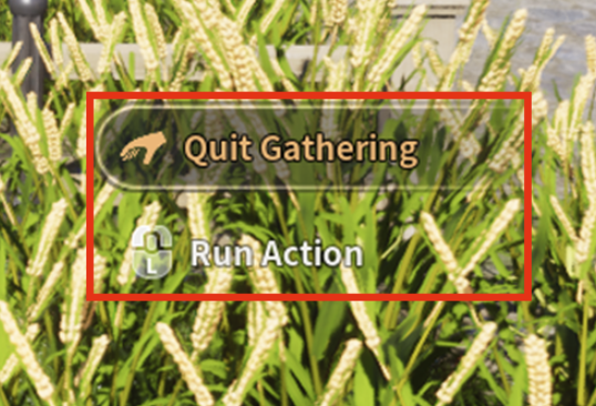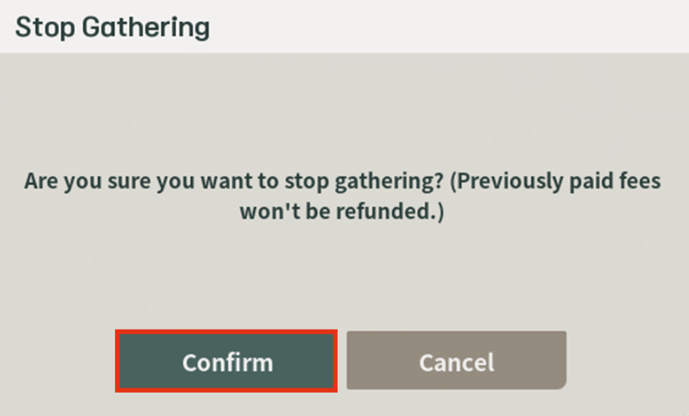 만약 채집을 중단하고 싶다면 마우스 왼쪽 버튼을 길게 눌러 [Quit Gathering]을 실행한 후, stop gathering팝업에서 [Confirm]을 클릭합니다.