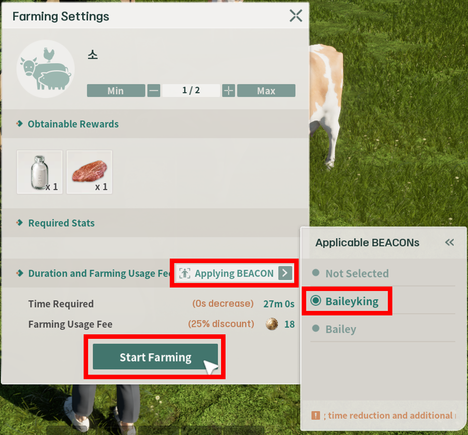 비컨을 이용해 파밍을 진행할 수도 있습니다. 파밍을 희망하는 개체의 여물통에 가까이 다가가면 파밍 아이콘이 나타나며, 왼쪽 마우스를 길게 눌러 파밍 기능을 실행합니다.