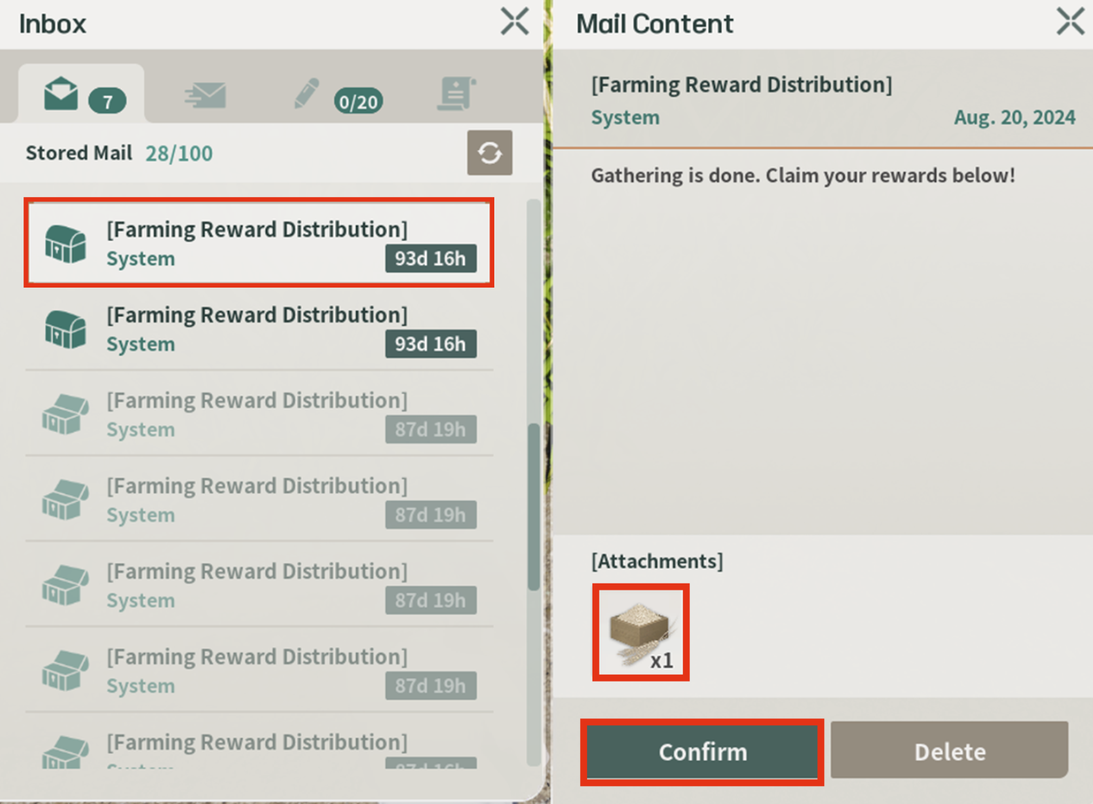 파밍을 완료한 아이템은 [ESC]버튼을 눌러 [Mail] 기능으로 들어가 확인할 수 있습니다.