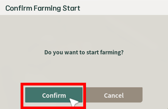 파밍 준비가 완료되었으면 [Start Gathering] 버튼을 누르고, 파밍 시작 확인 창에서 [Confirm] 버튼을 누릅니다.