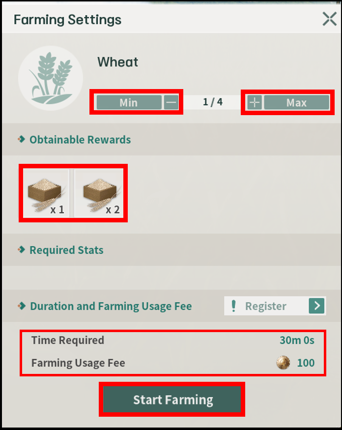 'Time Required and Gathering Fee' 옆에 있는 [Register]아이콘을 눌러 파밍을 적용할 비컨을 선택합니다. 파밍 팝업의 [Confirm]을 누른 후 파밍을 시작합니다.