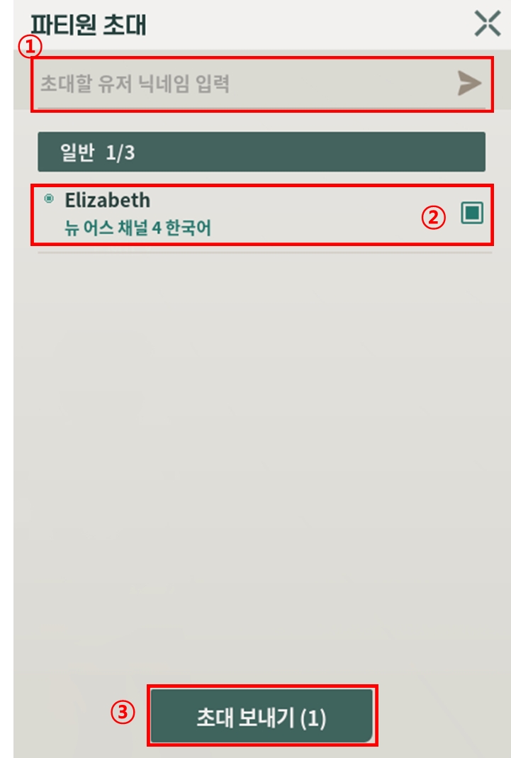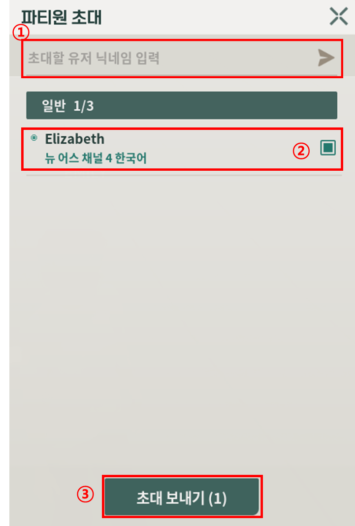1-2. 친구 목록에서 초대하거나 초대할 유저 닉네임 입력을 통해 파티원을 초대해 보세요!