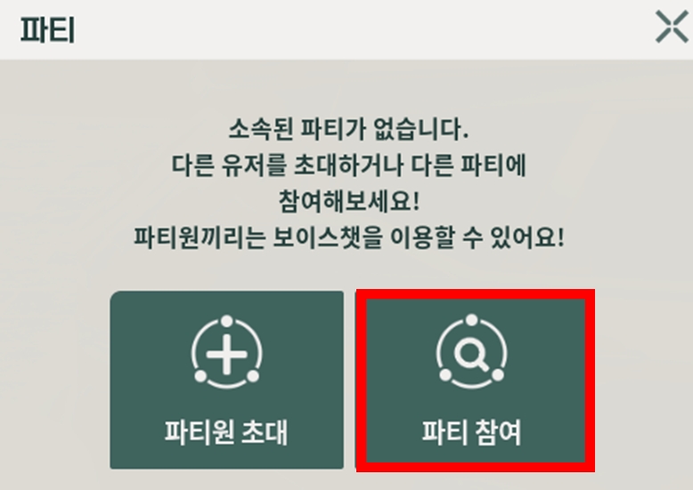 2-1. 키보드 [P]버튼 클릭 후, [파티 참여]버튼을 클릭해 주세요.