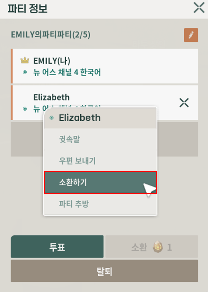 7-1. 소환하고 싶은 파티원의 사용자명 위에 마우스 오른쪽 버튼을 클릭하여 - [소환하기] 버튼을 클릭해 주세요.