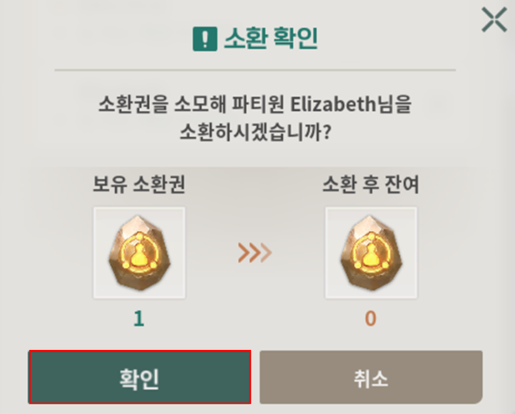 파티원 소환권은 소모품이므로 사용 즉시 개수가 차감됩니다!