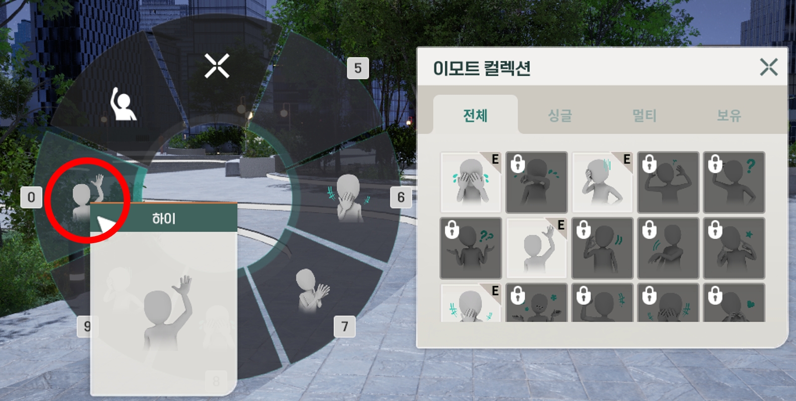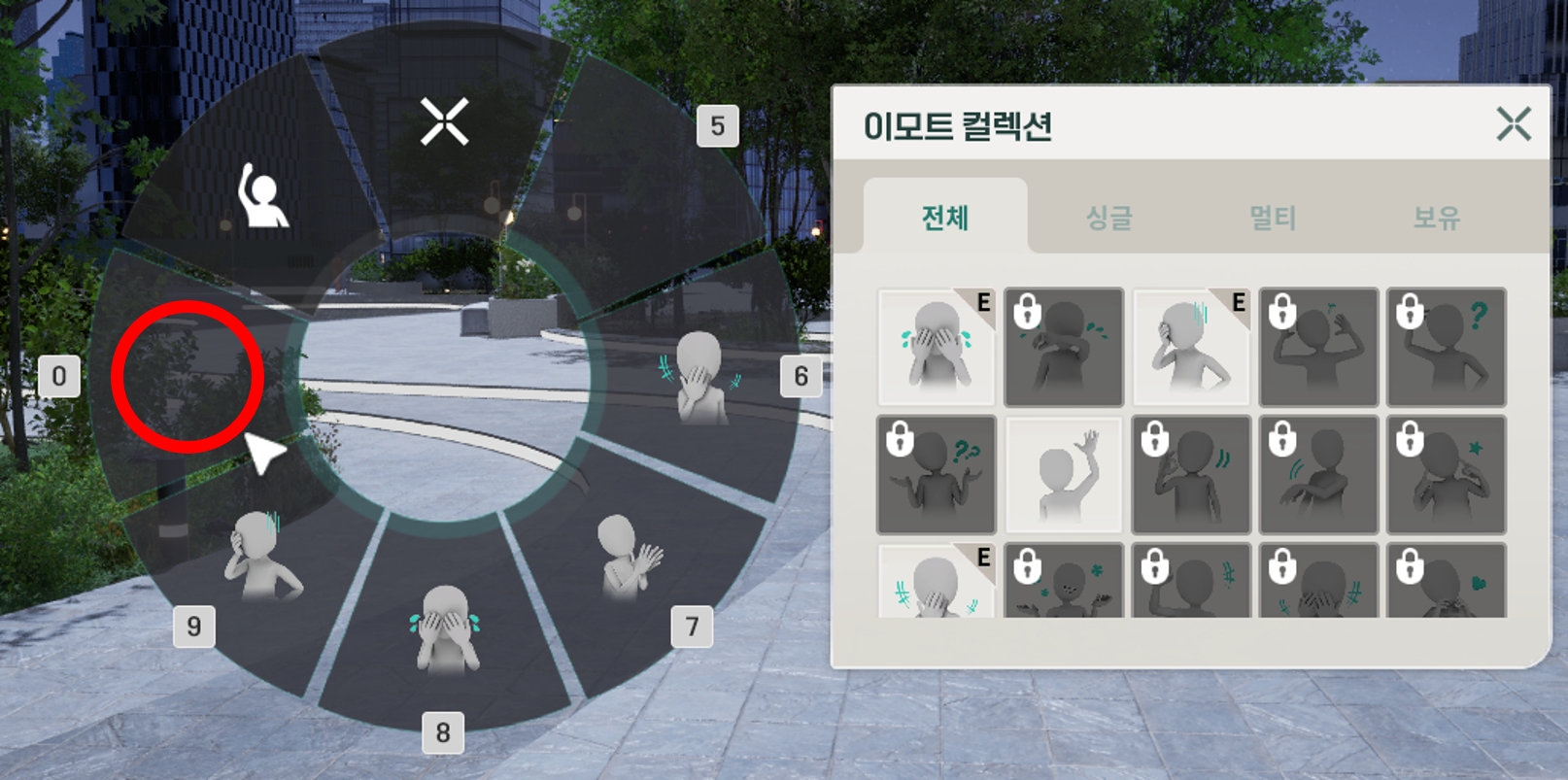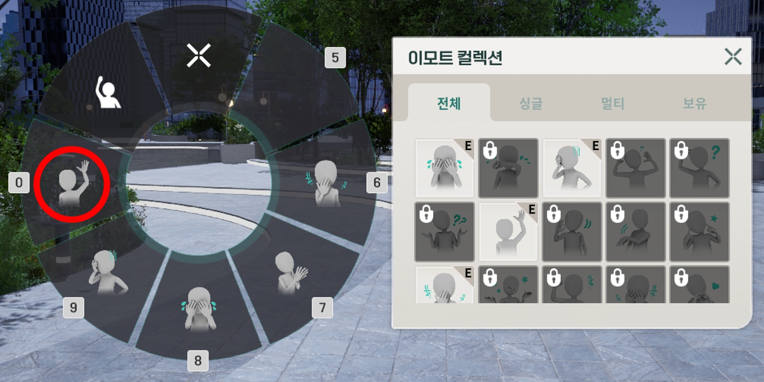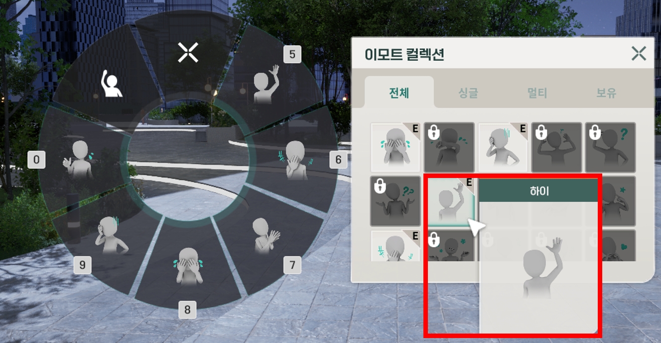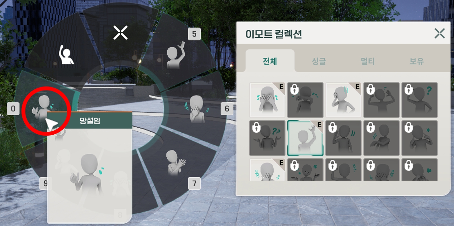 [R]키를 눌러 표현하고 싶은 이모트를 클릭하면 원하는 감정 표현을 할 수 있습니다.