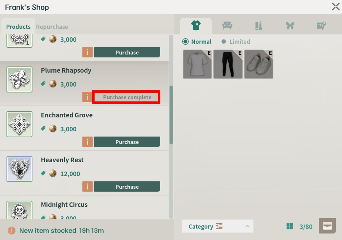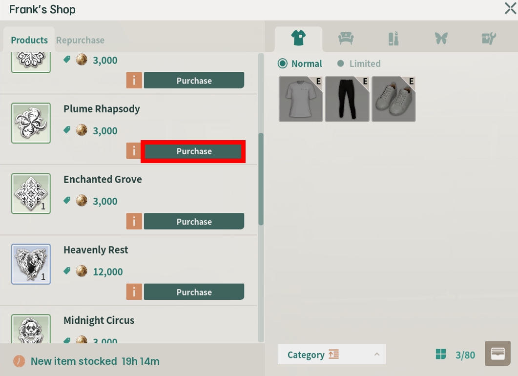 Check the available tattoos in the [Products] tab at Frank's Shop. After confirming the desired tattoo, click the [Purchase] button.