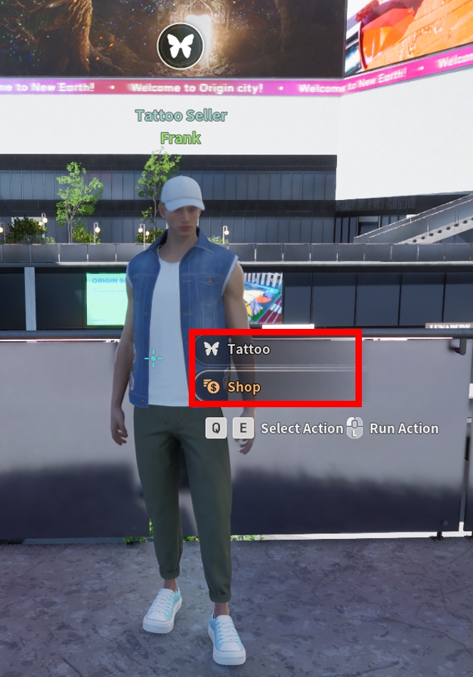 Visit the NPC Tattoo Seller Frank and select the [Shop], then click.