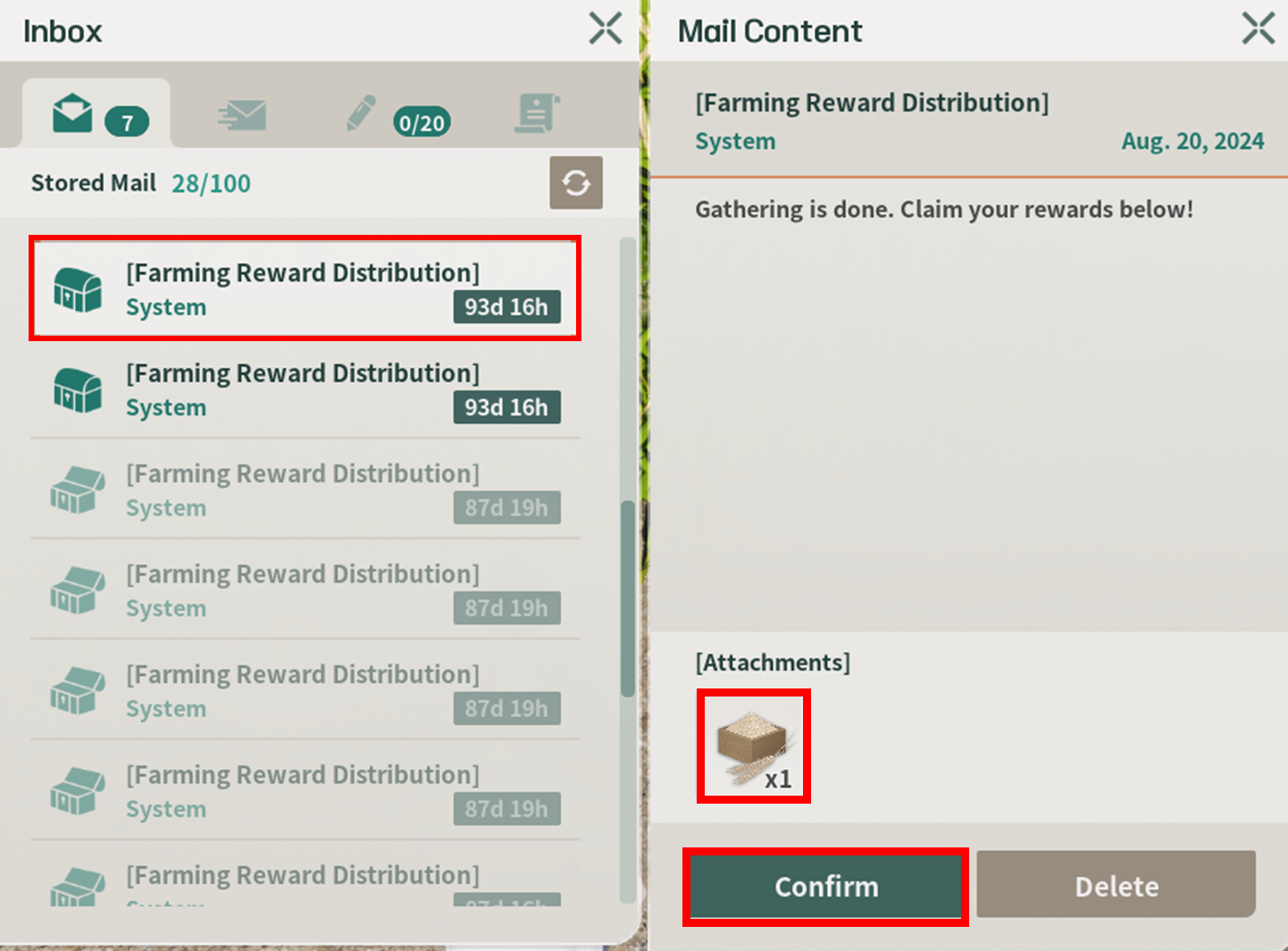 Select the BEACON you want to use for gathering by pressing the [Register] icon next to 'Time Required and Gathering Fee' Then, press [Confirm] in the confirmation window to start gathering.