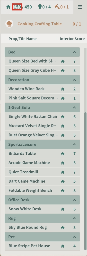 You can check the interior score for each piece of furniture in the menu on the right.