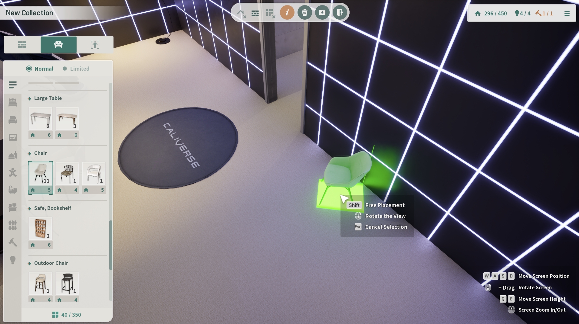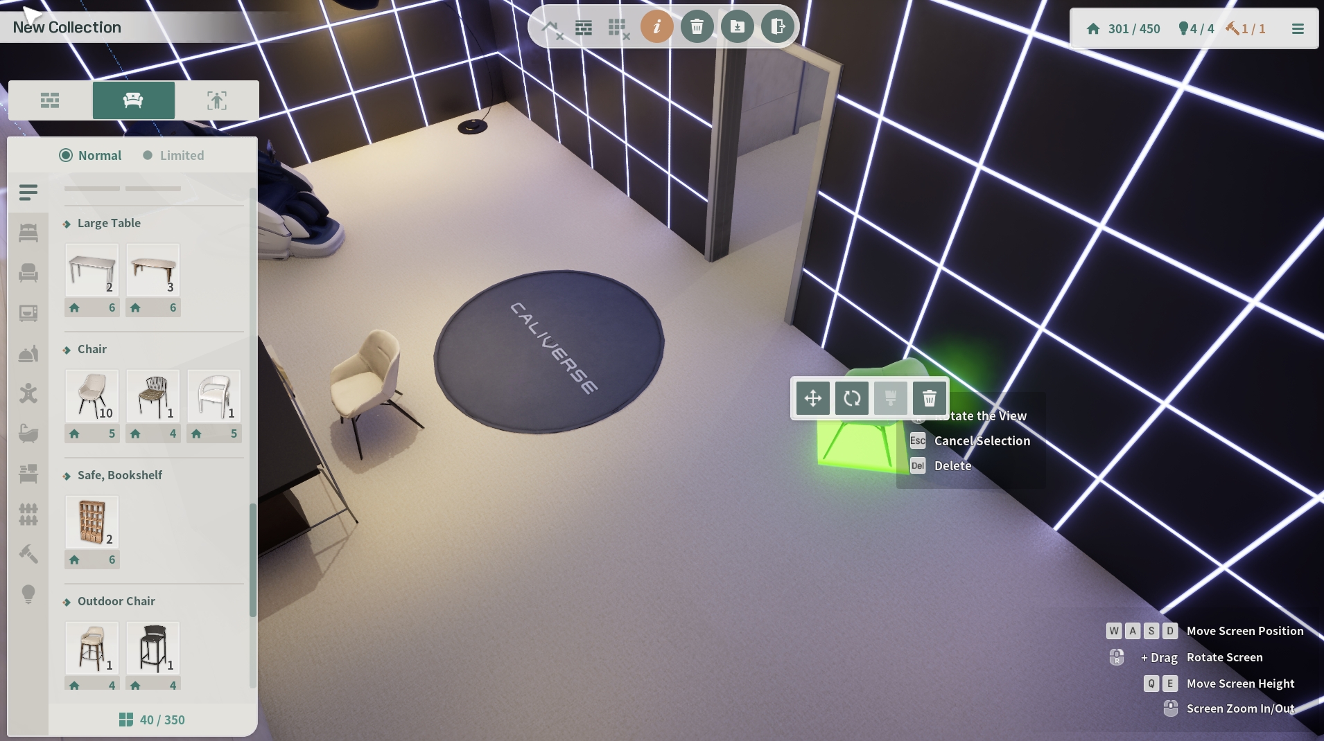 すでに配置された家具またはビーコンをインベントリに入れるには、オブジェクトをクリックして 「DELETE」ボタンを押します。