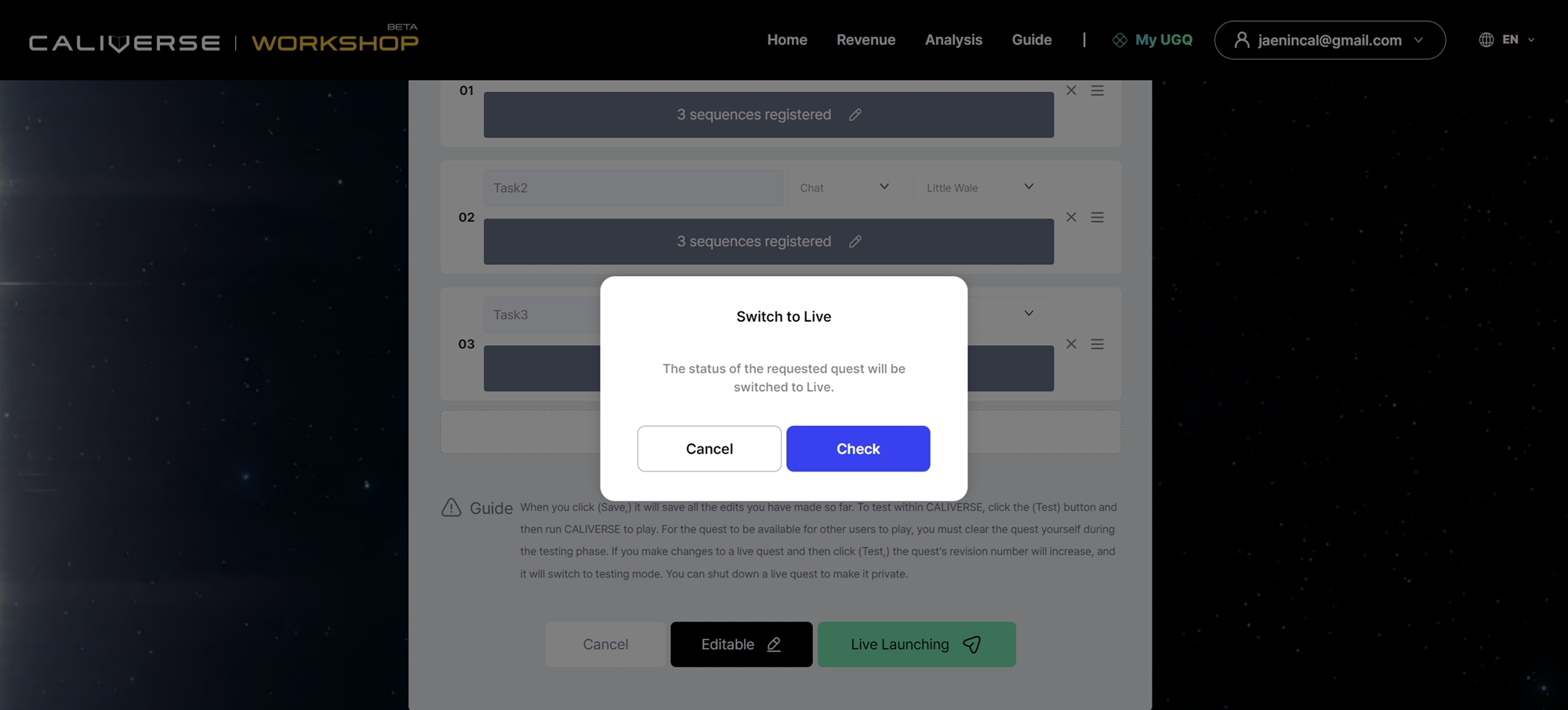 - 「Live」状態になると、一般ユーザーがUGQボードからそのクエストを確認し、プレイできるようになります。