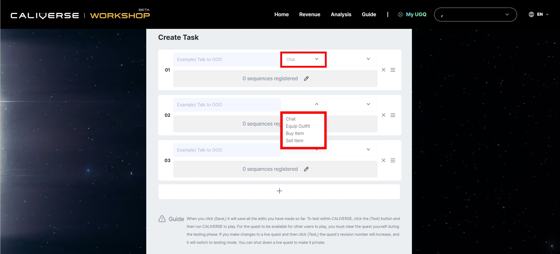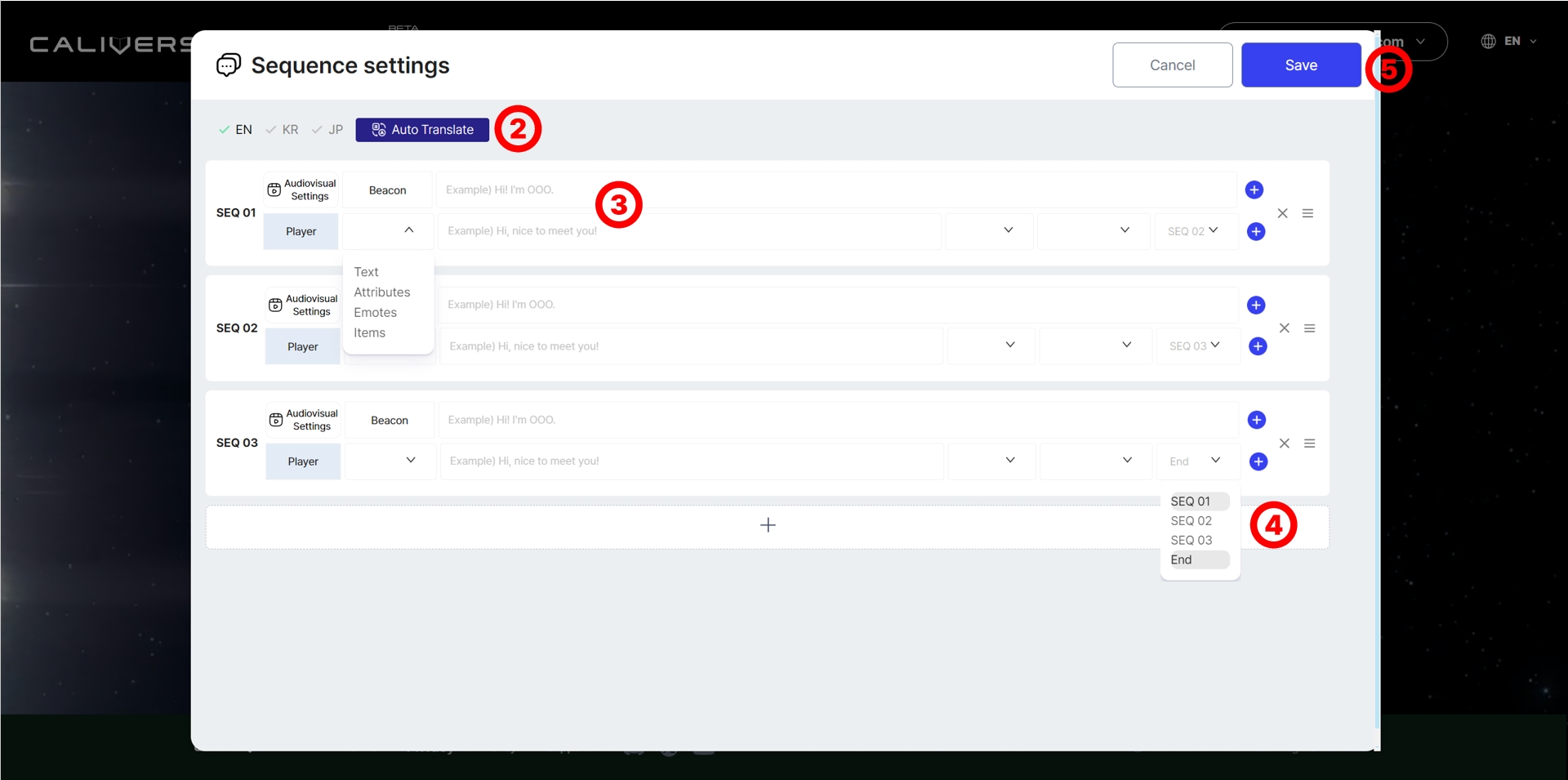 各Taskに対して、ビーコンとプレイヤーが交わす対話の「シーケンス*」を入力できます。 *シーケンス:Quest内で対話が進行する順序や流れのこと。プレイヤーの行動に応じて発生する一連の進行を指します。シーケンス設定時には英語(EN)タブの内容作成が必須です。